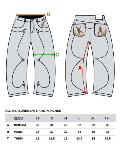 Metal Carabiner IncludedDual Back Pocket Artwork (200,000+ stitches)100% Organic Cotton (Baggy Fit)