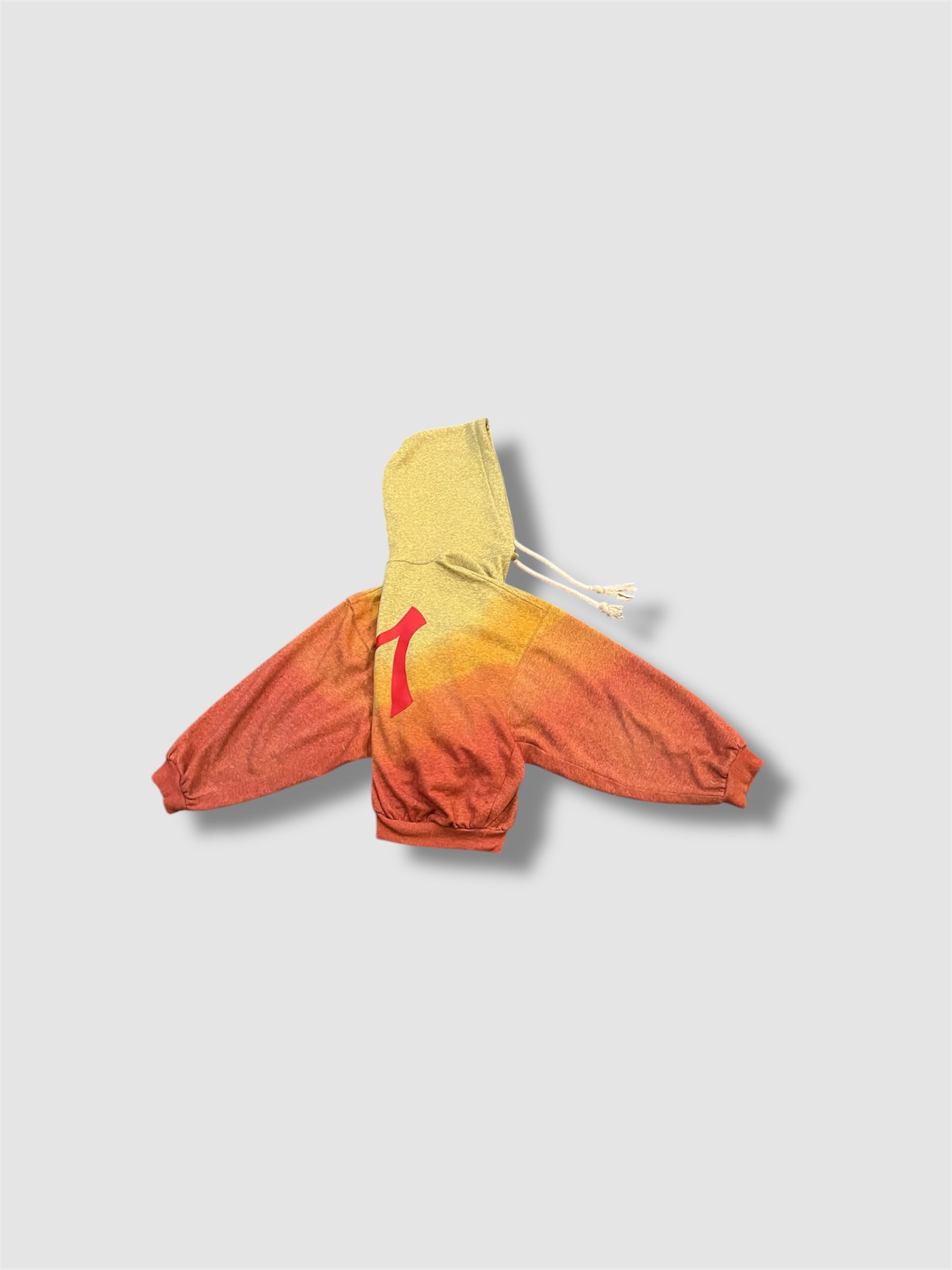 "For this design, its an oversized hoodie with 3 colors. This Combination is inspired by a sun set with Gold, orange, and, red orange. With red leather JAYEMADE Logo inserted on the front and back, inspired by the NYC Yankees."