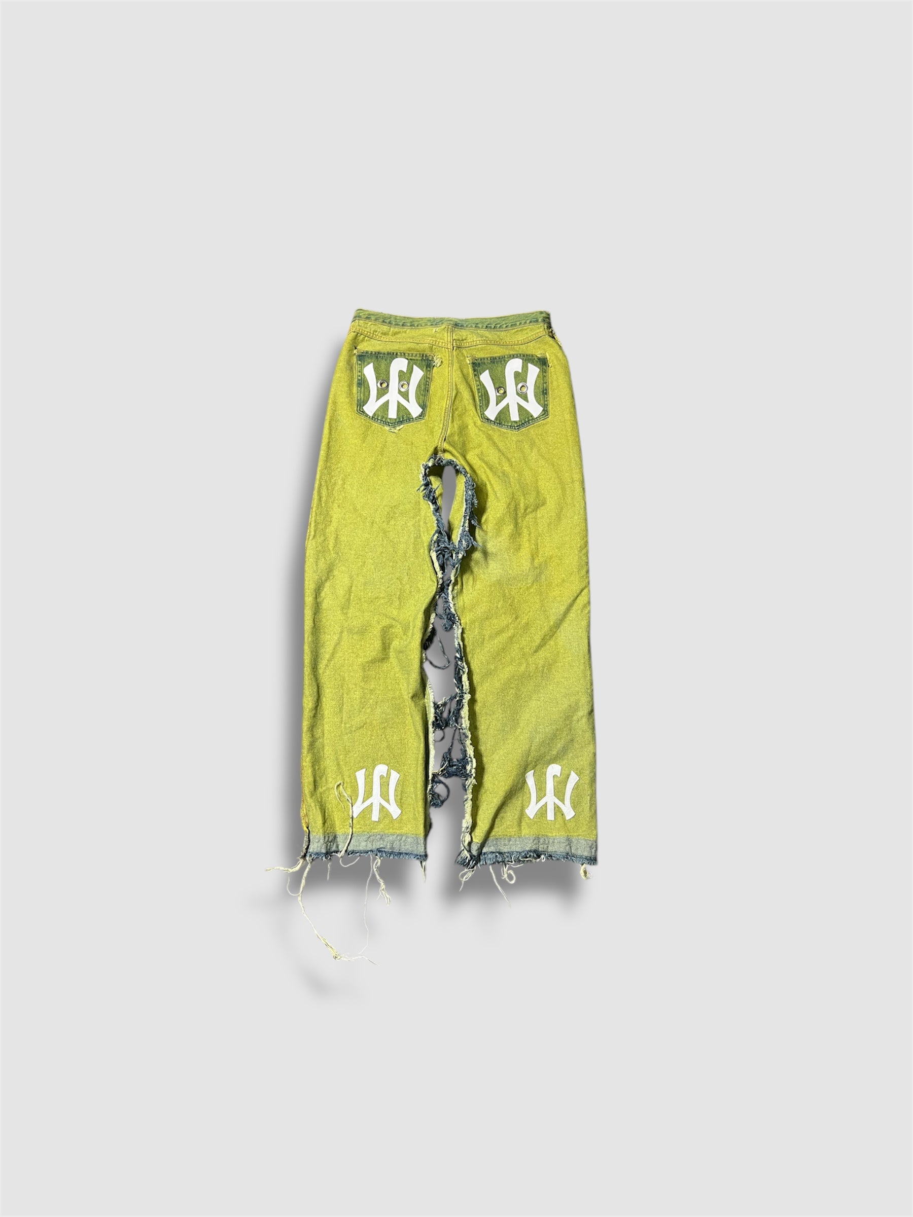 "For this design, it’s an hand dyed apple green Skate fit denim. The jeans are designed inside out. Back pockets on the outside with a JM Yankee inspired logo. Each pocket flaps include 3 silver eyelets as well as the both back pockets."